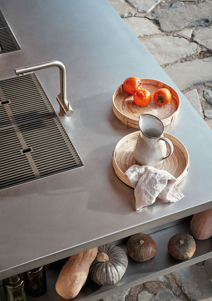 Cast iron and marble island - The design was inspired by the construction of modern bridges, which have two supporting structures at the sides and a suspended horizontal element joining them. The island conveys solidity and strength while looking light and slender. On show at Chelsea Harbour.